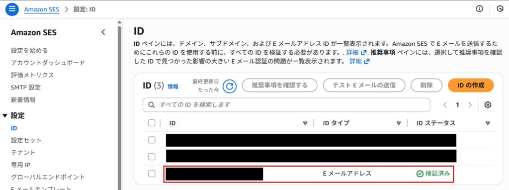※画像では複数のIDを登録していますが一番下のものが今回使用しているもので、IDタイプが「Eメールアドレス」で、IDステータスが「検証済み」となっています。
