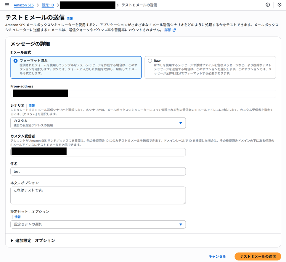 検証が完了したら、SESからテストメールを送ってみます。