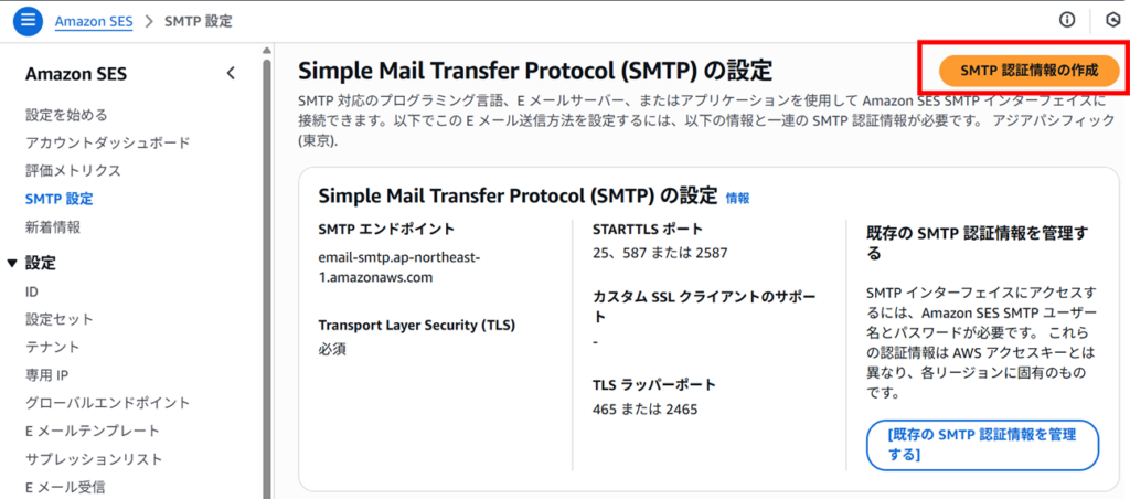 - 「SMTP認証情報の作成」をクリック